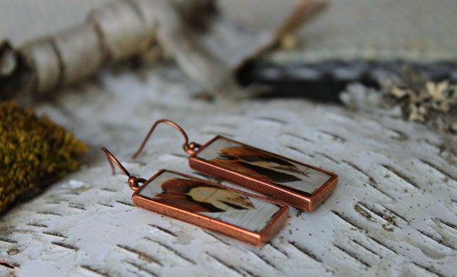 Mini Dangle earrings with charcoal resin overlaid with Birch Bark and 24k gold leaf.