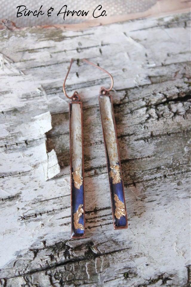 Mini Dangle earrings with navy blue resin overlaid with Birch Bark and 24k gold leaf.